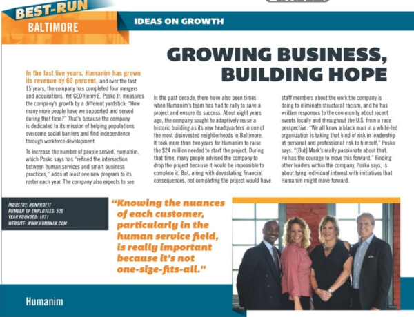 Humanim and its executive leadership were recently featured in Smart CEO magazine in their Best-Run Baltimore feature. The article “Growing Business, Building Hope” details how Humanim has grown as an organization to serve more populations and the unique business approach it takes to its growth.