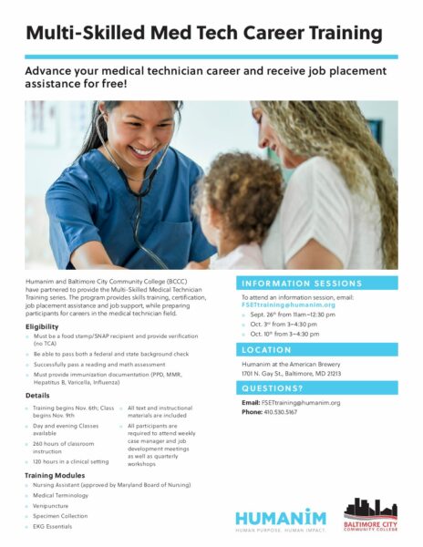 Humanim and Baltimore City Community College (BCCC) have partnered to provide the Multi-Skilled Medical Technician Training series. This program provides skills training, certification, job placement assistance and job suppot, while preparing participants for careers in the medical technician field.
