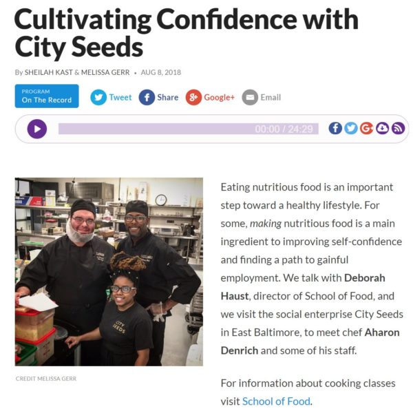 Our culinary social enterprises City Seeds and School of Food were recently featured on WYPR’s On The Record with Sheilah Kast. On “Cultivating Confidence with City Seeds,” the City Seeds and School of Food teams give an in depth overview of what our culinary social enterprise division is all about – from corporate catering and community cooking classes, to job training and employment – then take you into the kitchen to meet the staff who make it all possible.