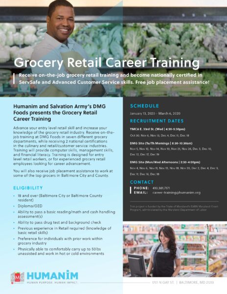 Advance your entry level retail skill and increase your knowledge of the grocery retail industry. Receive on-the-job training at DMG Foods in seven different grocery departments, while receiving 2 national certifications in the culinary and retail/customer service industries. Training will provide computer skills, management skills, and financial literacy. Training is designed for entry level retail workers, or for experienced grocery retail employees looking for career advancement. You will also receive job placement assistance to work at some of the top grocers in Baltimore City and County.