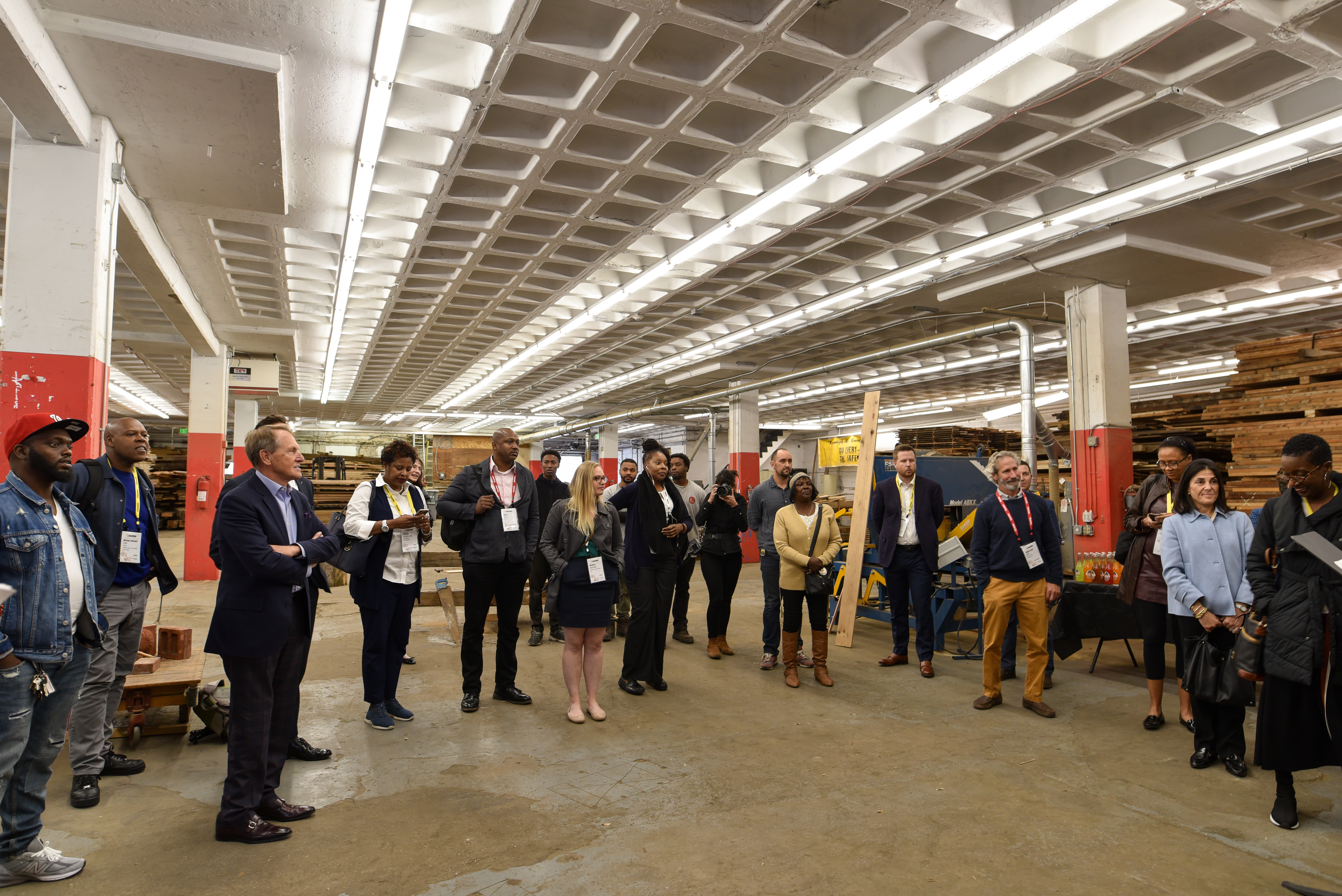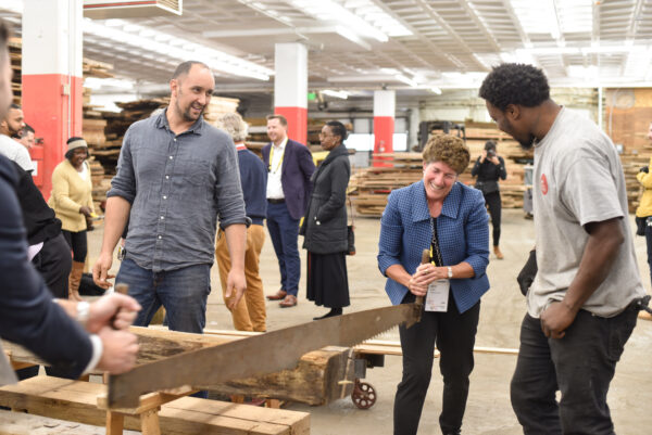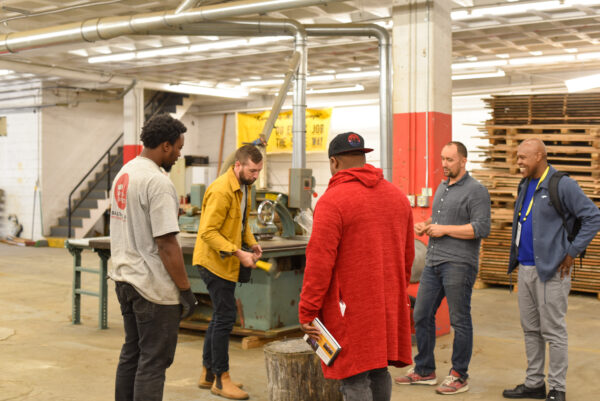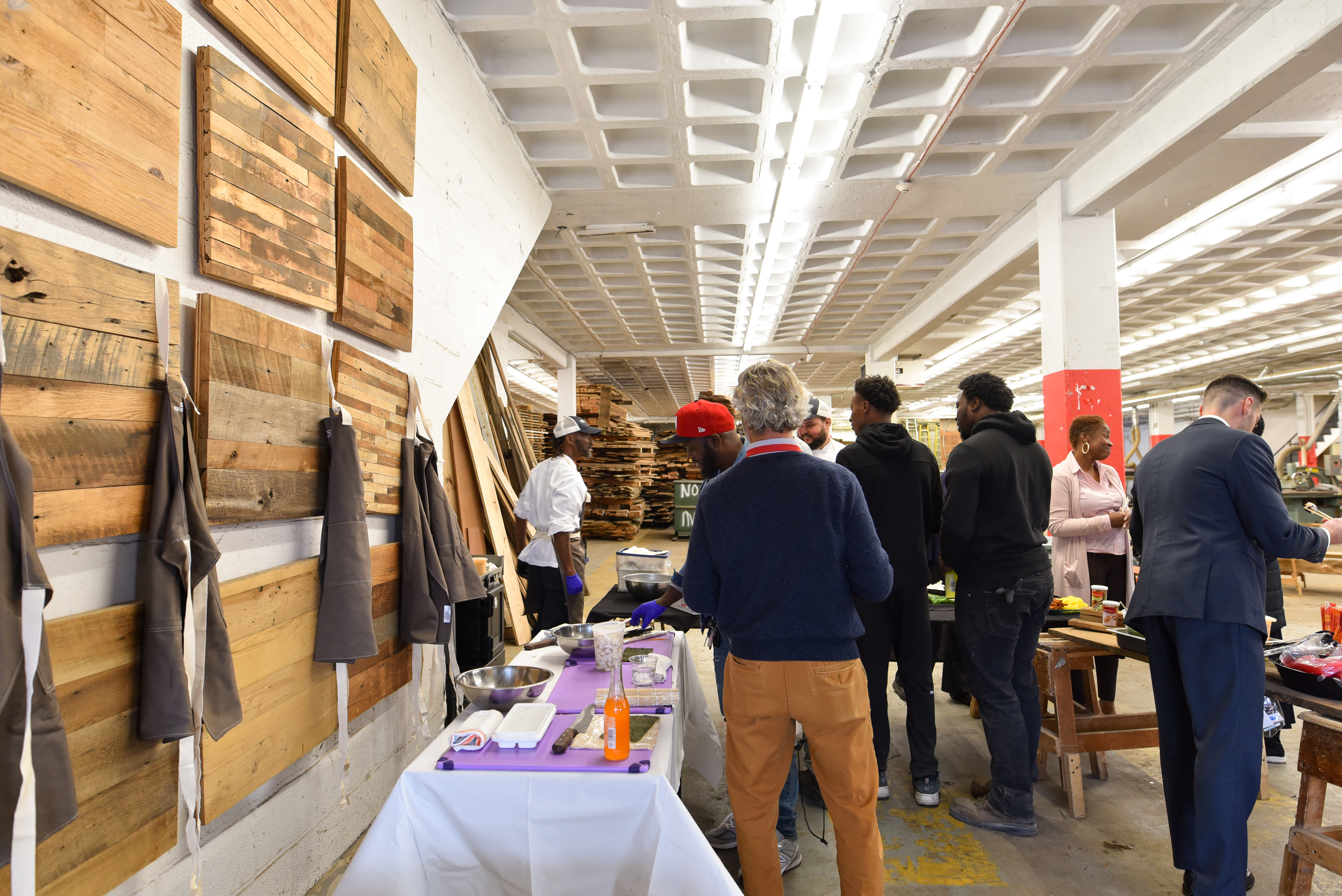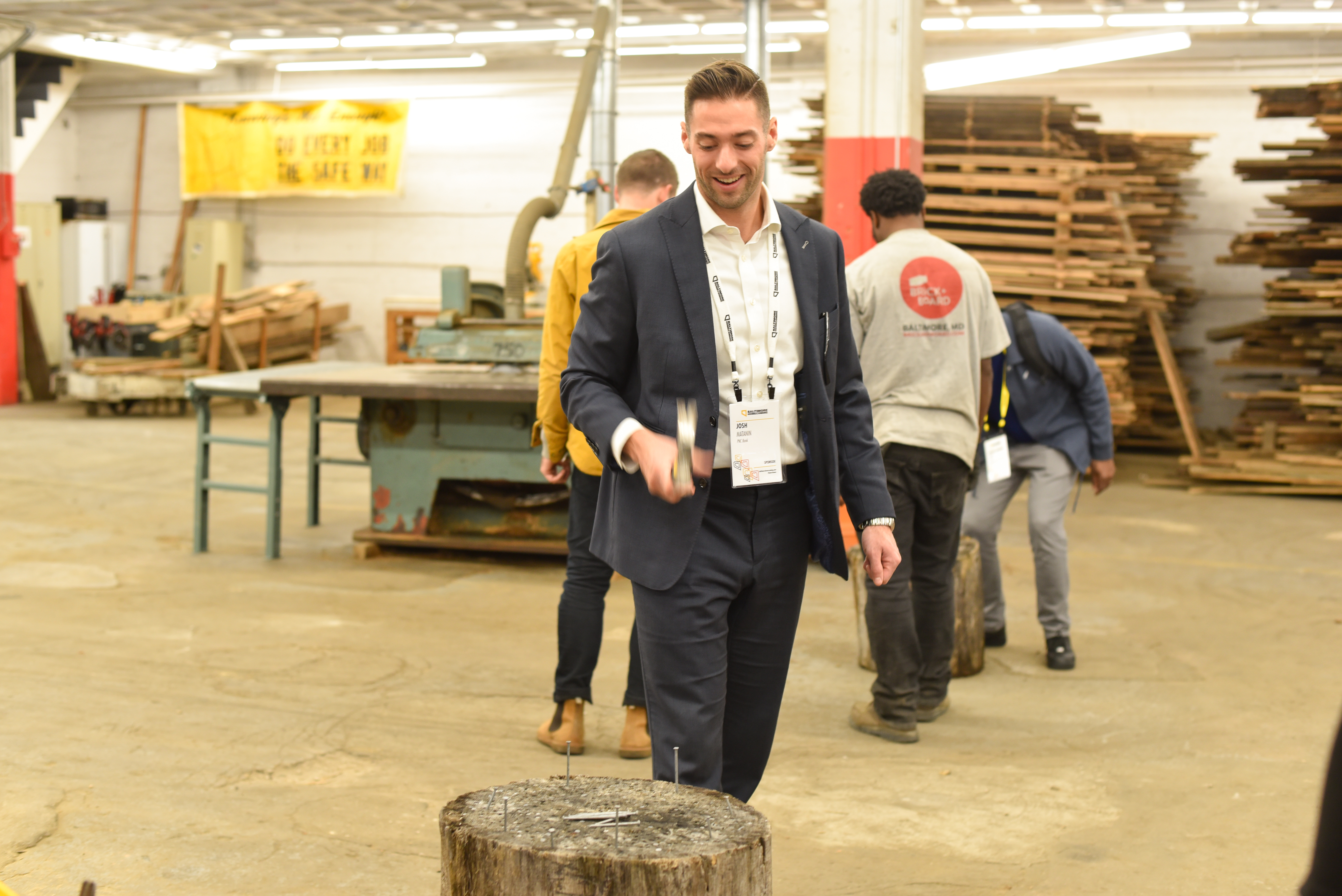 Participants in the “Revitalizing East Baltimore” tour were able to learn more about Humanim’s social enterprise work in Baltimore, including a visit to Details Deconstruction sites, our Baltimore office at the American Brewery Building, and a visit to the Brick + Board warehouse, where visitors learned how we reclaim wood taken from Baltimore rowhomes to be processed and resold for new design and construction projects – as well as how our work creates skilled, living wage jobs for individuals with barriers to employment. The visit culminated with some games of Stump, and a sushi making lesson by our culinary social enterprise, City Seeds.