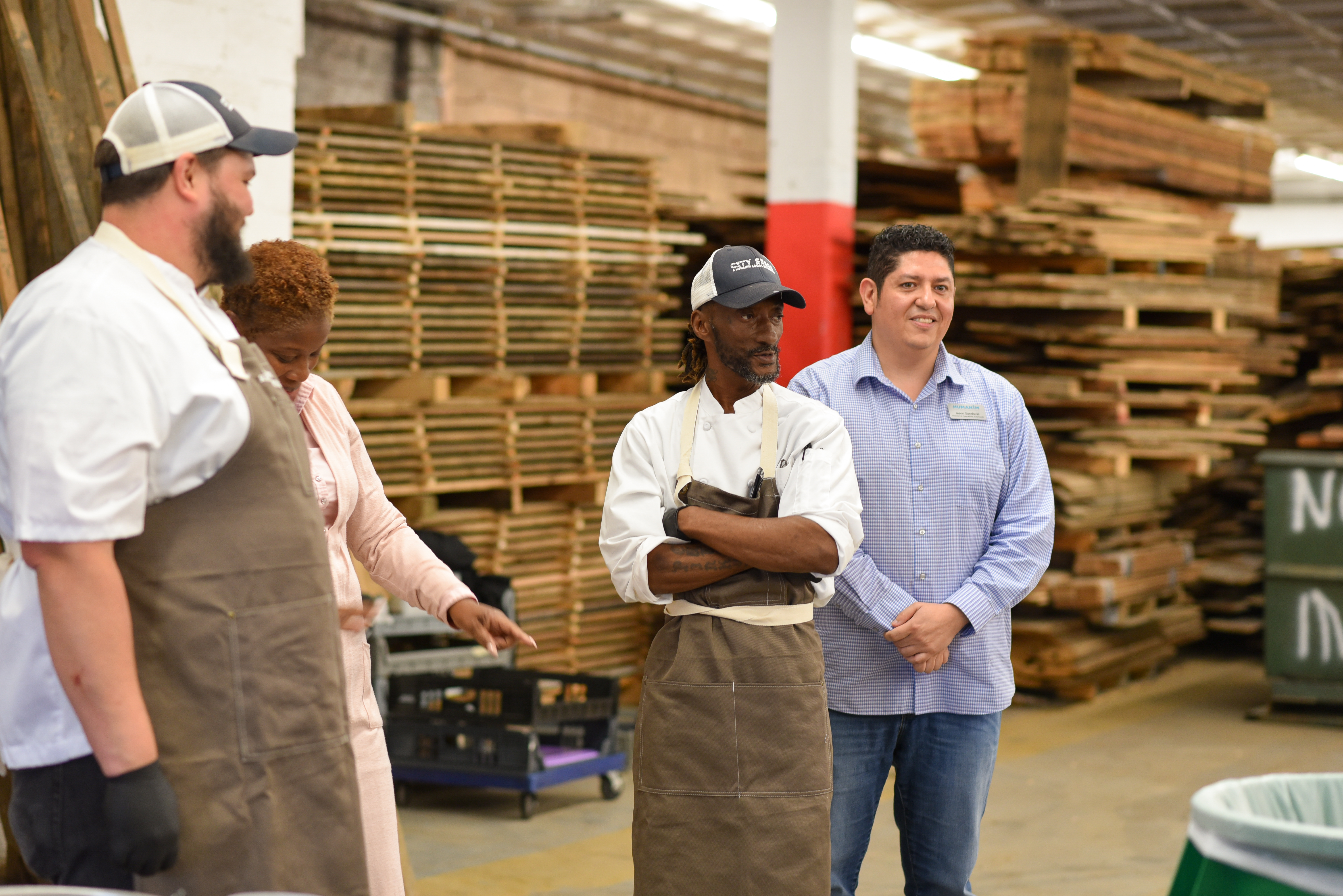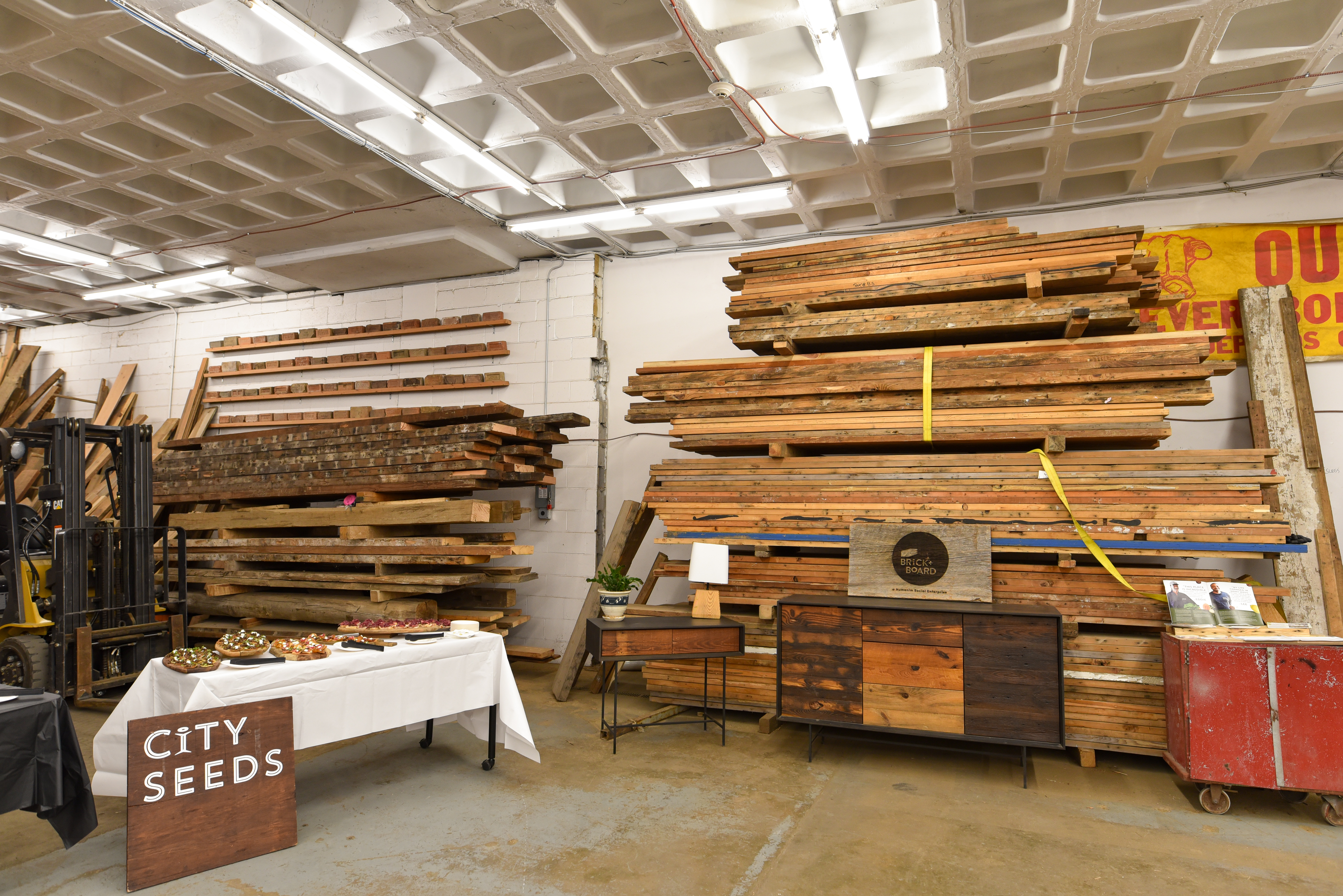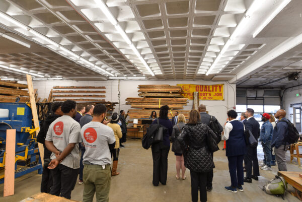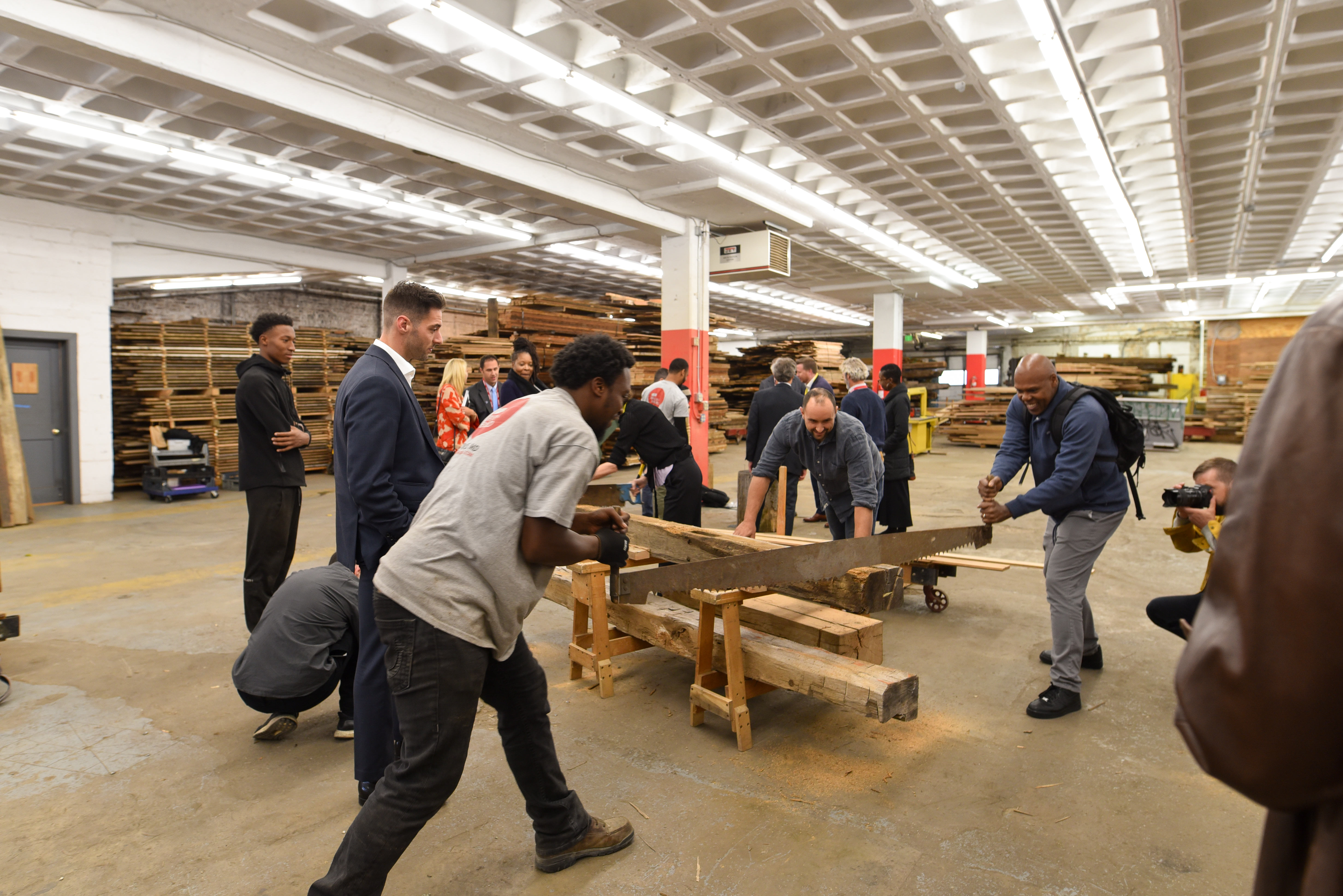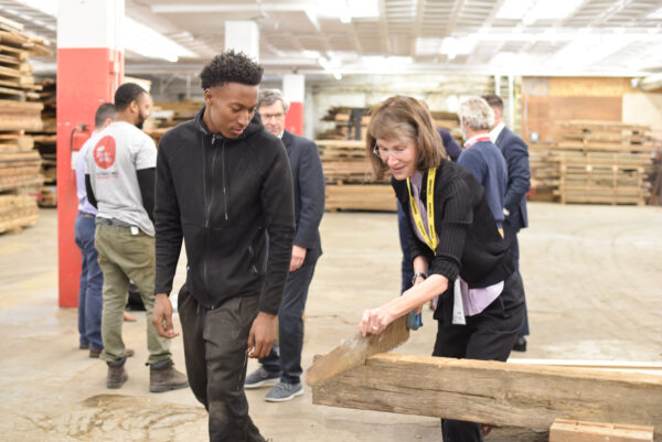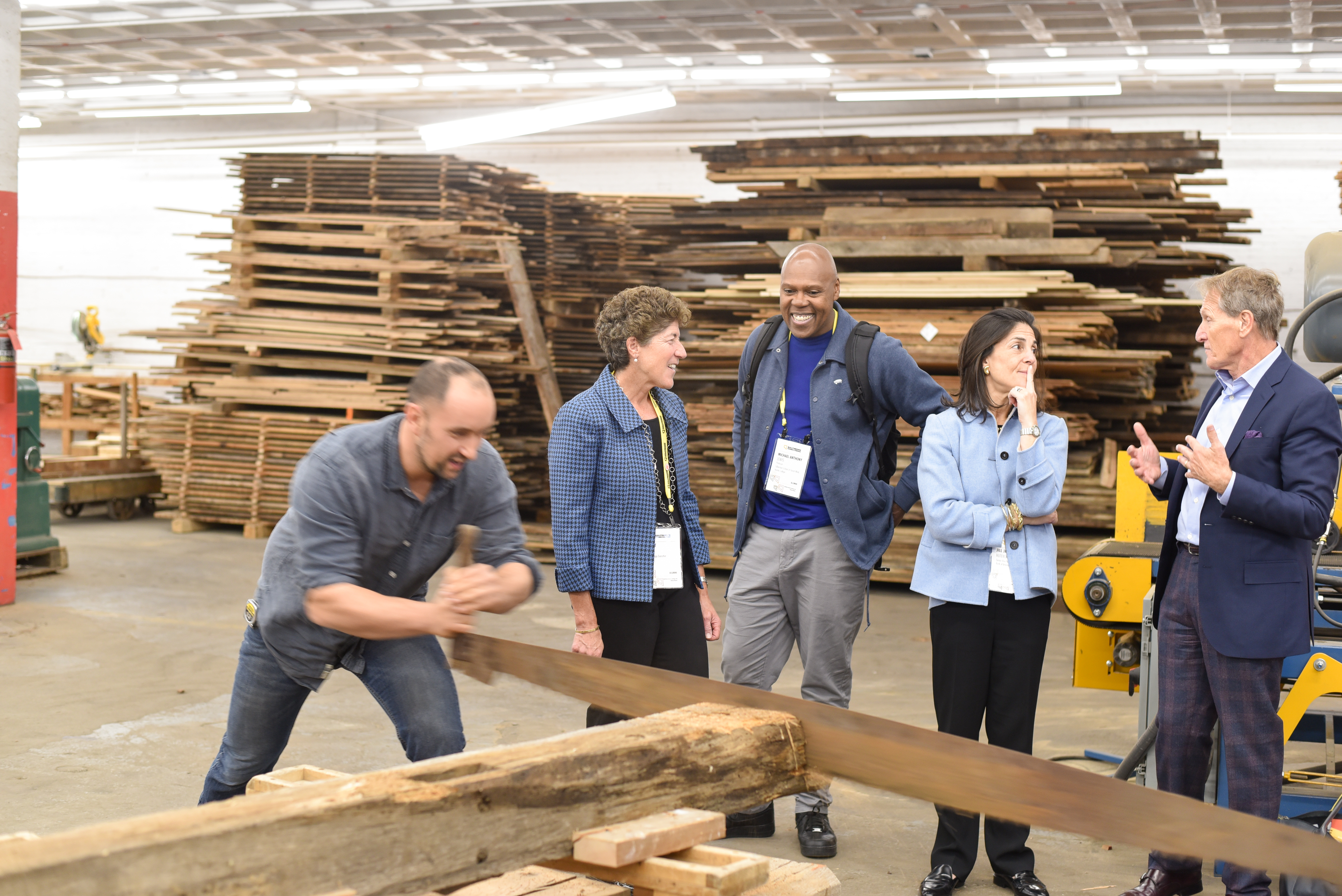 Participants in the “Revitalizing East Baltimore” tour were able to learn more about Humanim’s social enterprise work in Baltimore, including a visit to Details Deconstruction sites, our Baltimore office at the American Brewery Building, and a visit to the Brick + Board warehouse, where visitors learned how we reclaim wood taken from Baltimore rowhomes to be processed and resold for new design and construction projects – as well as how our work creates skilled, living wage jobs for individuals with barriers to employment. The visit culminated with some games of Stump, and a sushi making lesson by our culinary social enterprise, City Seeds.