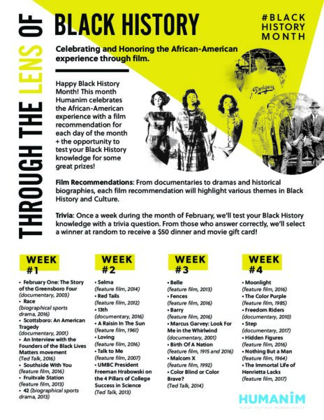 Throughout the month of February, Humanim will be celebrating the African-American experience through film, with a film recommendation for each day of the month. From documentaries to dramas and historical biographies, each film recommendation will highlight various themes in Black History and Culture.