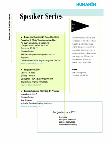 Humanim’s Developmental Disabilities department invites families, advocates, colleagues and clients to learn about recent and upcoming DDA service changes and answer any questions you may have through its Fall Speaker Series.