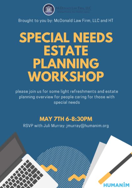 As part of Children’s Mental Health Week, our youth services program Healthy Transitions in partnership with McDonald Law Firm, LLC – will be holding an Estate Planning Workshop and Overview for people caring for those with special needs.