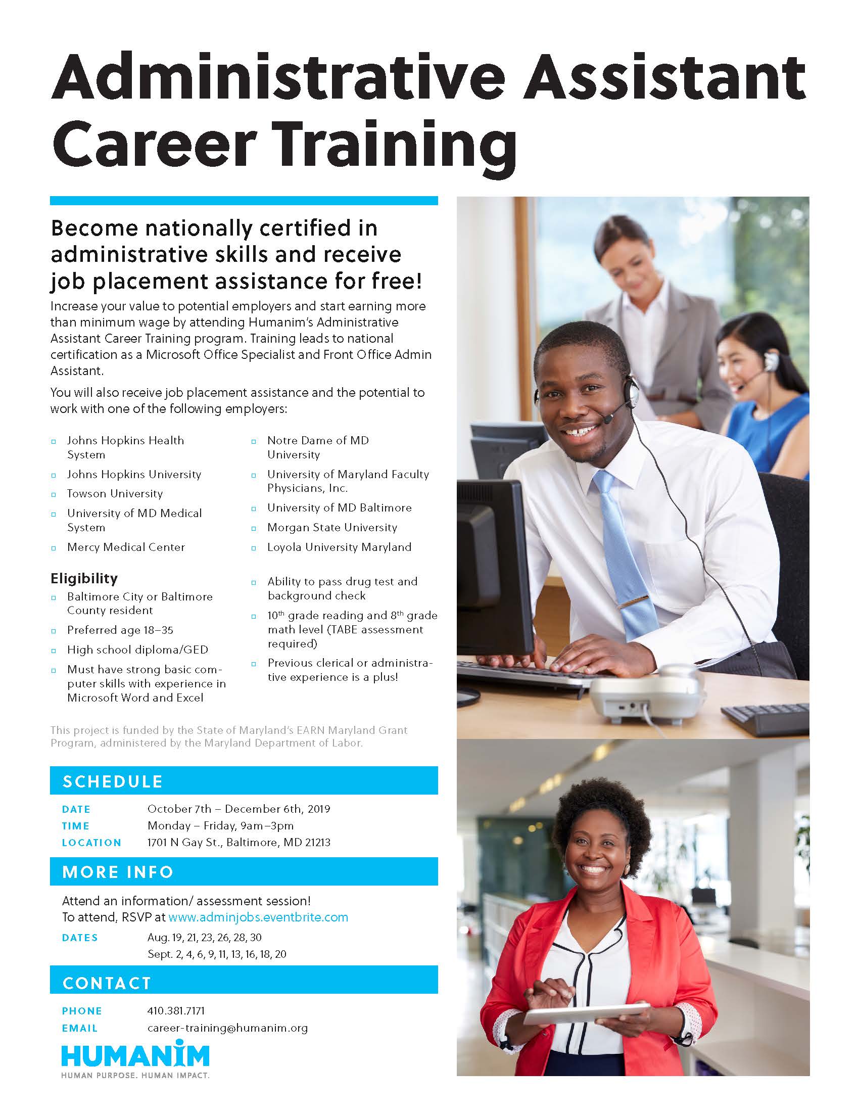 Interested in an administrative career? Increase your value to potential employers and start earning more than minimum wage by attending Humanim’s Administrative Assistant Career Training program. Receive specialized training, professional certification, and job placement assistance.