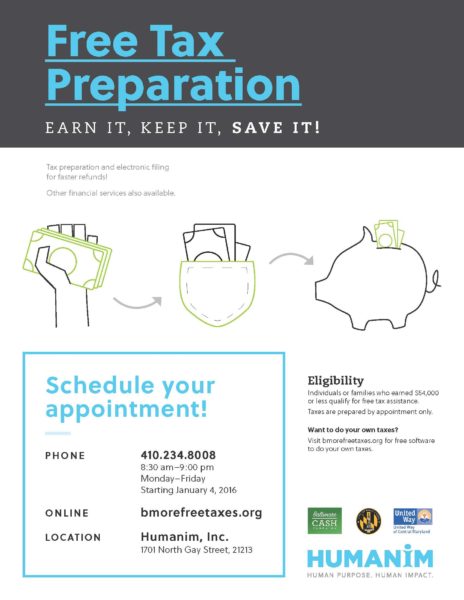 In partnership with Baltimore Cash Campaign, we are once again hosting free tax preparation services right here at Humanim, every Friday, Saturday, and Sunday through tax season!