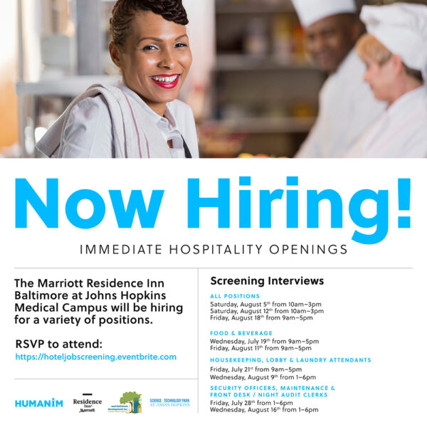 We are currently recruiting for positions at the brand new Marriott Residence Inn Baltimore at Johns Hopkins Medical Campus. If you are a Baltimore City resident with great customer service skills and hospitality experience, we are looking for you!
