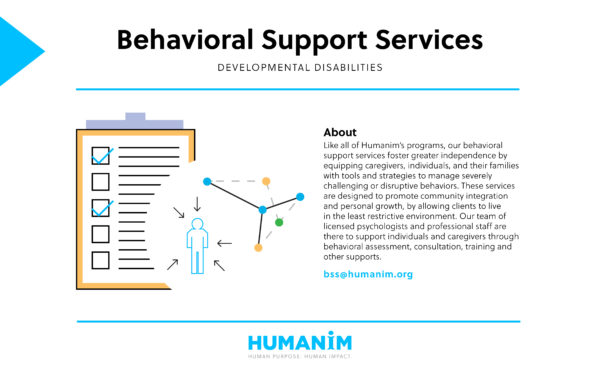 This month we spotlight out Behavioral Support Services! Like all of Humanim’s programs, our behavioral support services foster greater independence by equipping caregivers, individuals, and their families with tools and strategies to manage severely challenging or disruptive behaviors. These services are designed to promote community integration and personal growth, by allowing individuals to live in the least restrictive environment. Our team of licensed psychologists and professional staff are there to support individuals and caregivers through behavioral assessment, consultation, training and other supports.