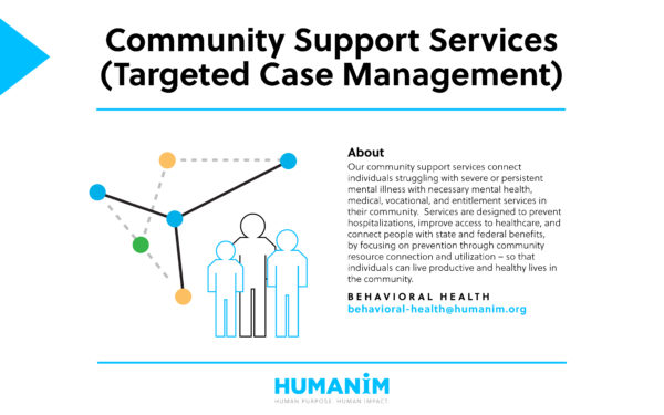 Our Community Support Services program is part of Humanim’s Behavioral Health Department. We connect individuals struggling with severe or persistent mental illness with necessary mental health, medical, vocational, and entitlement services in their community.